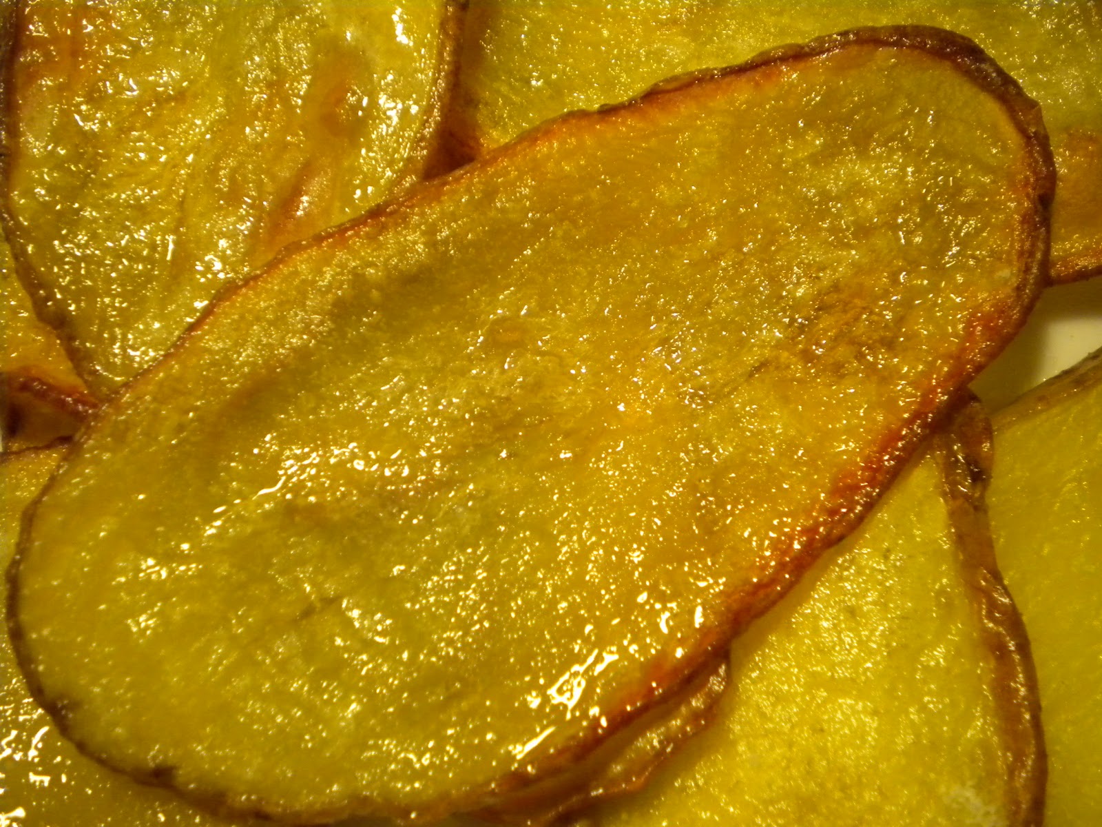 Rohr auf 200° C vorheizen > Erdäpfel in ca 3 – 4 mm dicke Scheiben schneiden