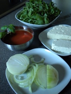 bei 180 ° C ins heiße Backrohr > kurz vor dem Servieren den frischen Ruccola darüber >