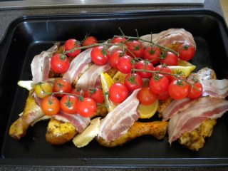Henderlteile mit Salz, Paprika, Oregano und Pfeffer kräftig würzen > danach in Butter scharf anbraten und wieder herausnehmen > Zitrone vierteln zusammen mit Paradeiser in einen großen Bäter legen > Hühnerteile dazu > Speck, Olivenöl und etwas Butter darüber >