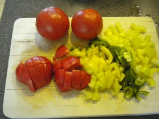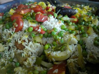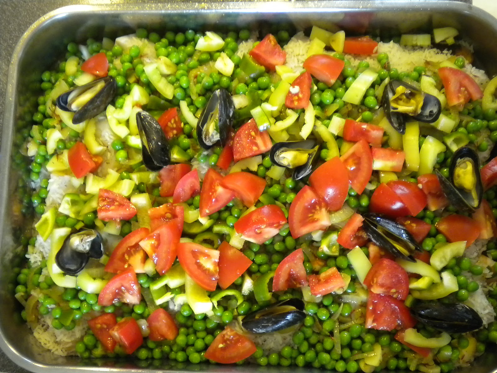 > etwas langkornreis gleichmäßig über fleisch und meeresfrüchte verteilen > fischfilets dazwischen legen > den restlichen reis darüberrieseln lassen > würfelig geschittene paradeiser und paprikaschoten gemeinsam mit den miesmuscheln obenauf verteilen >