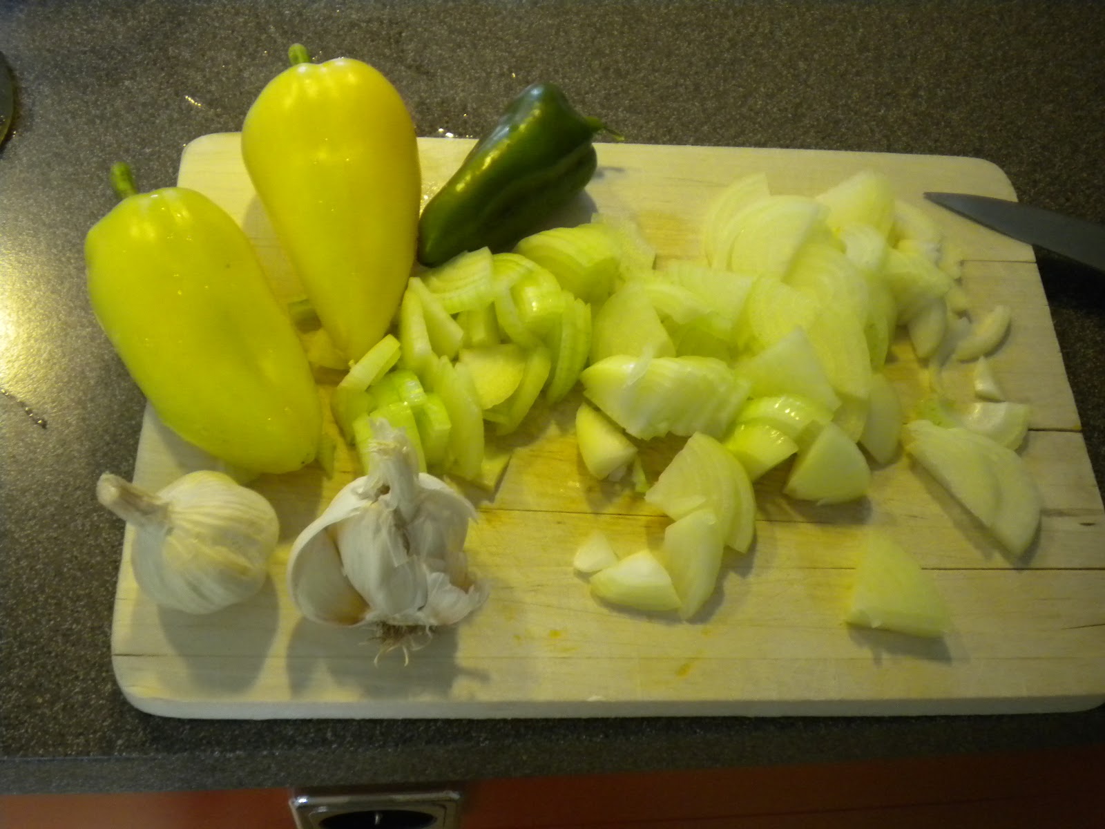 > hühnerteile (salzen und pfeffern) in rapsöl scharf anbraten > topf mit öl beiseite stellen, den brauche wir samt öl noch! > fleisch in großer pfanne verteilen >