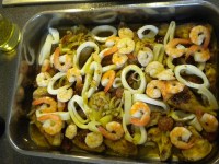 > chorizzo in scheiben schneiden > im öl der hühnerteile scharf anbraten und ebenfalls auf dem fleisch und fisch verteilen >