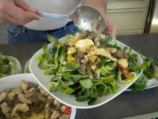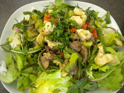 > fertiges Gemisch auf den Blattsalat legen > frischen Schnittlauch und Zitronenthymian darüber > mit Weißbrot servieren >