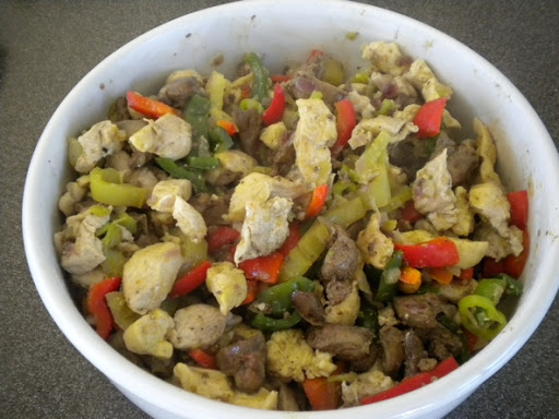 Hühnerbrust mit Zwiebel scharf anrösten > nach 10 min den Paprika und den in Ringe geschnittenen Olpfefferoni dazu geben > kurz mitrösten > Hühnerleber extra in etwas Zwiebel anrösten >