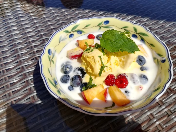 joghurt mit frischen früchten und einer kugel vanilleeis