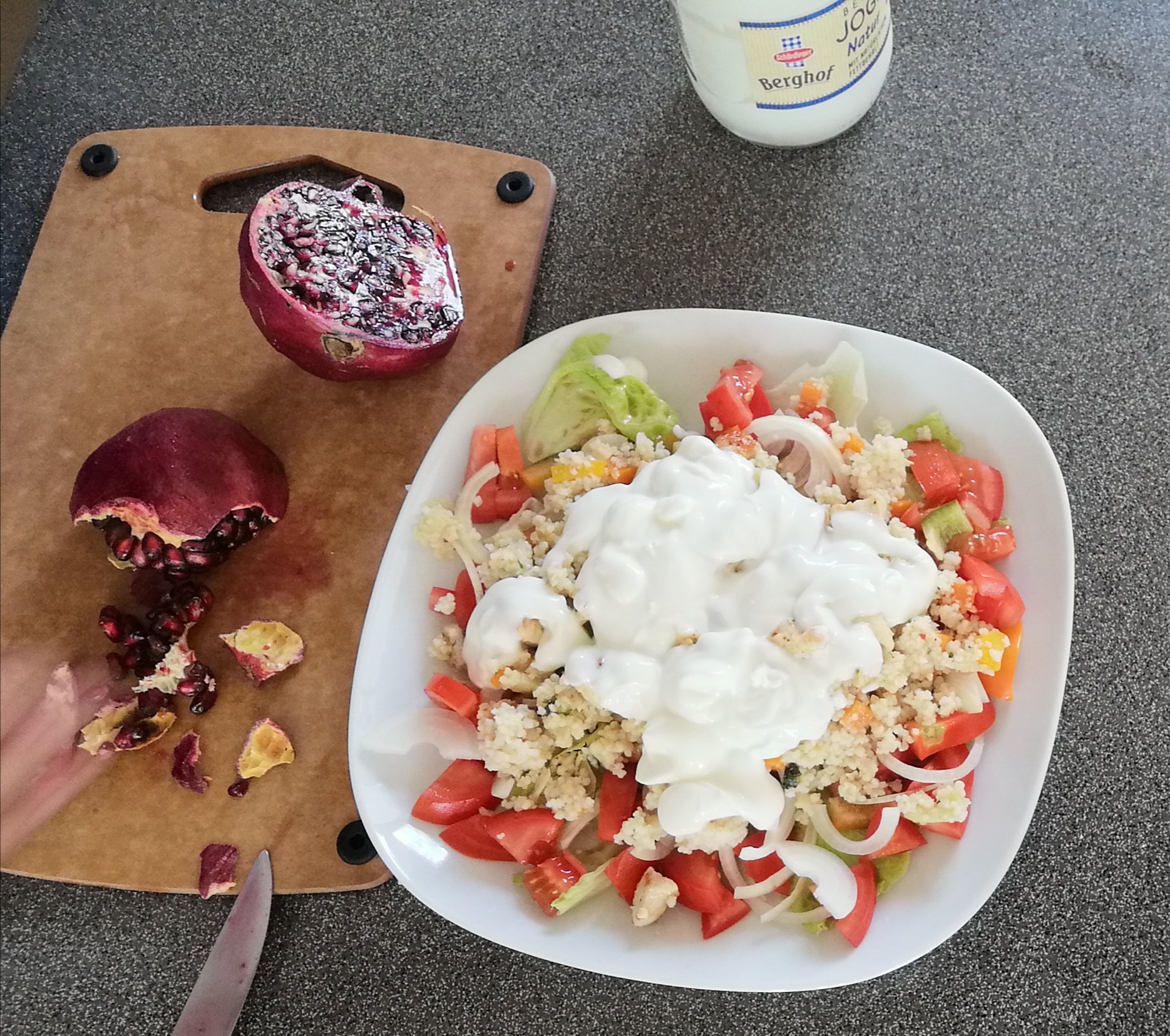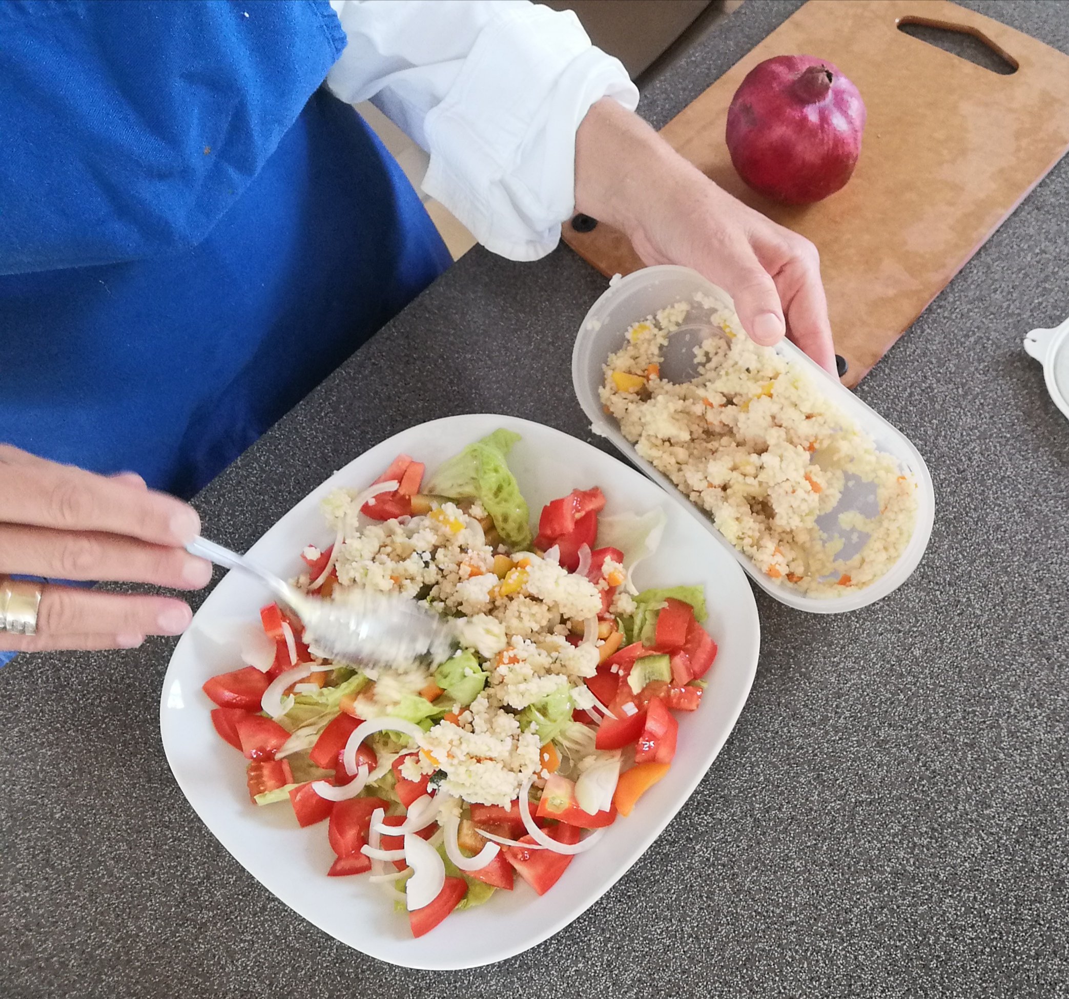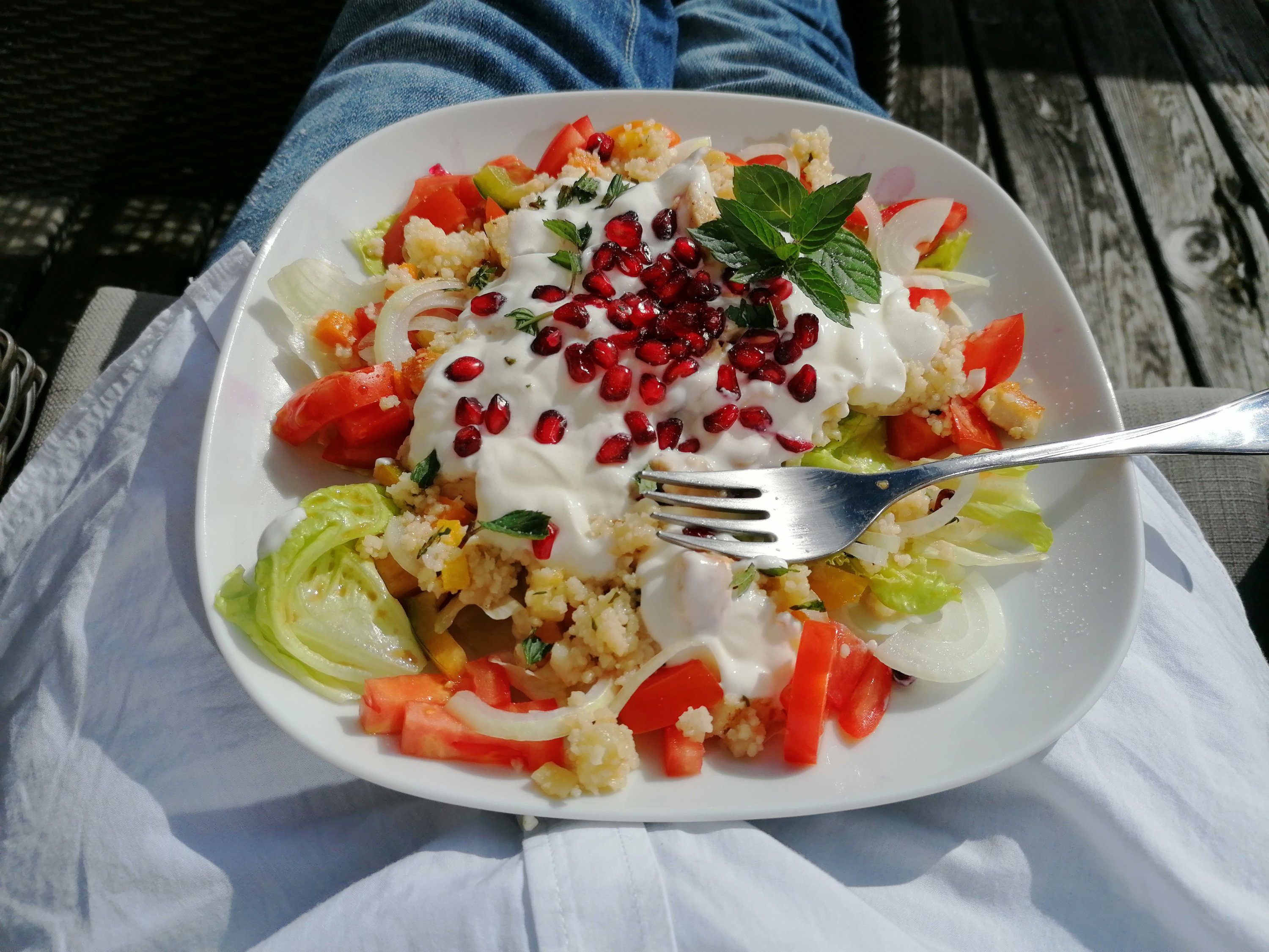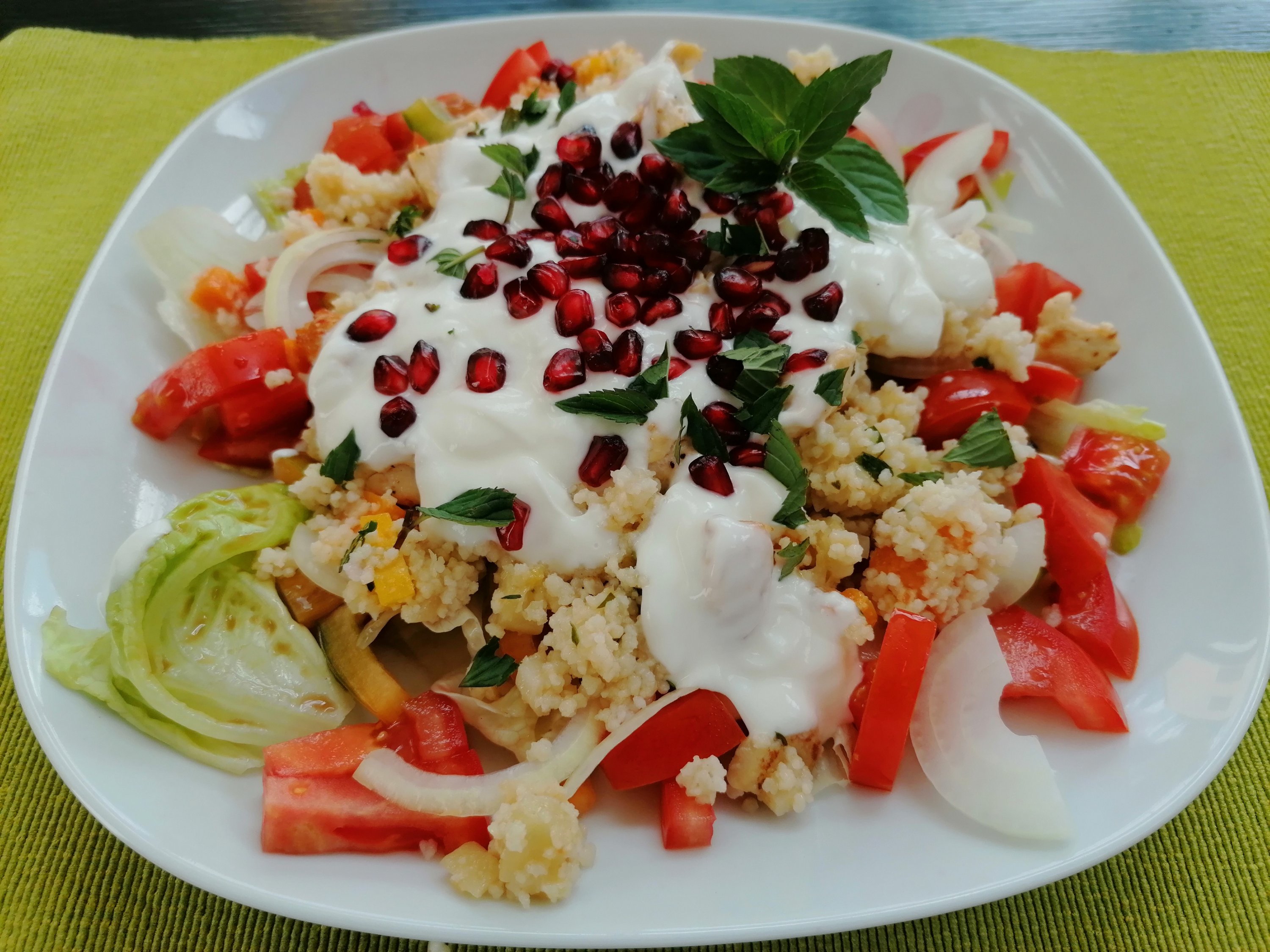 grüner salat als basis > gekochter und gewürzter couscous, paradeiser, grüner paprika und zwiebel darüber verteilen > dressing nach lust und laune