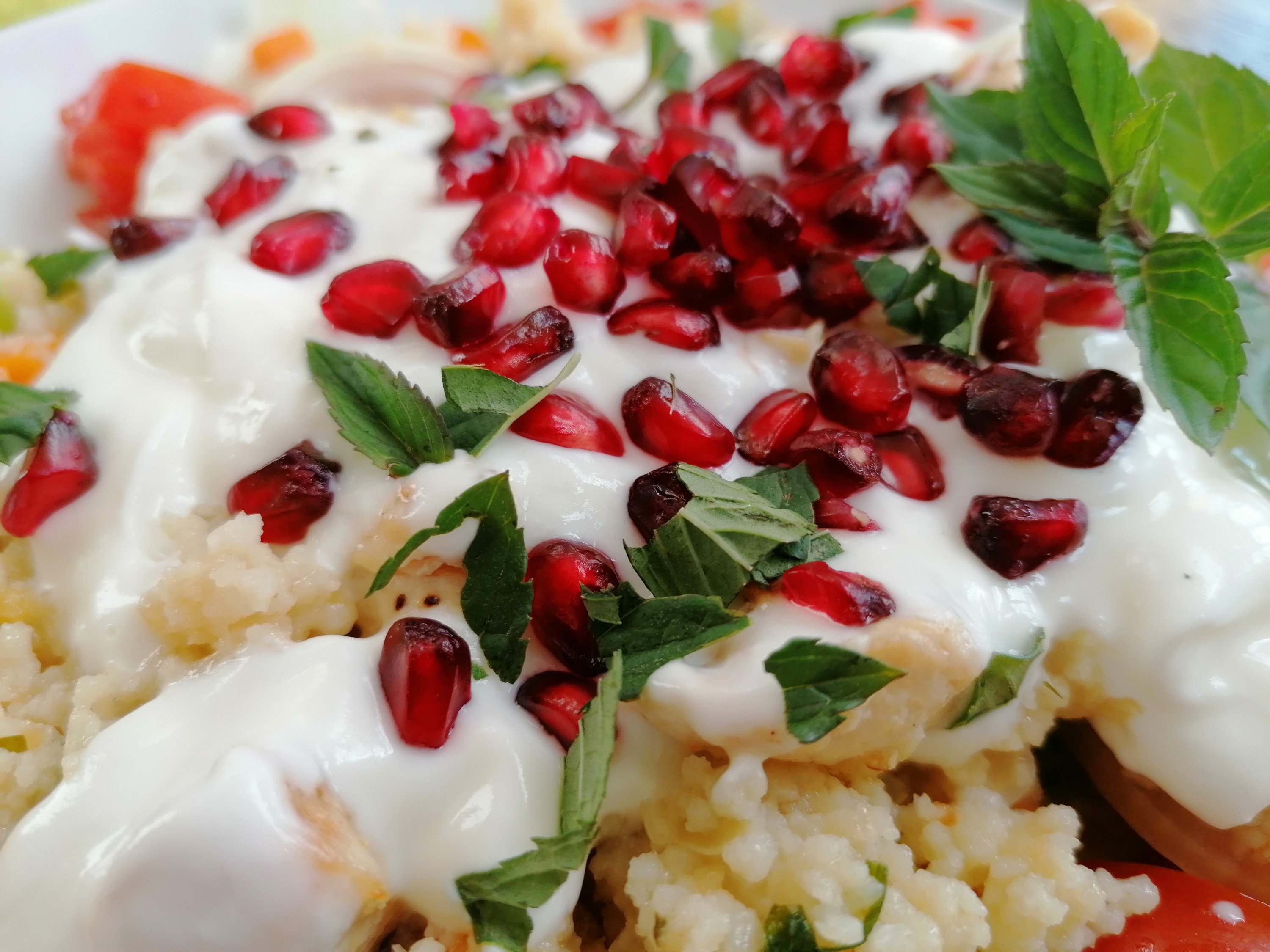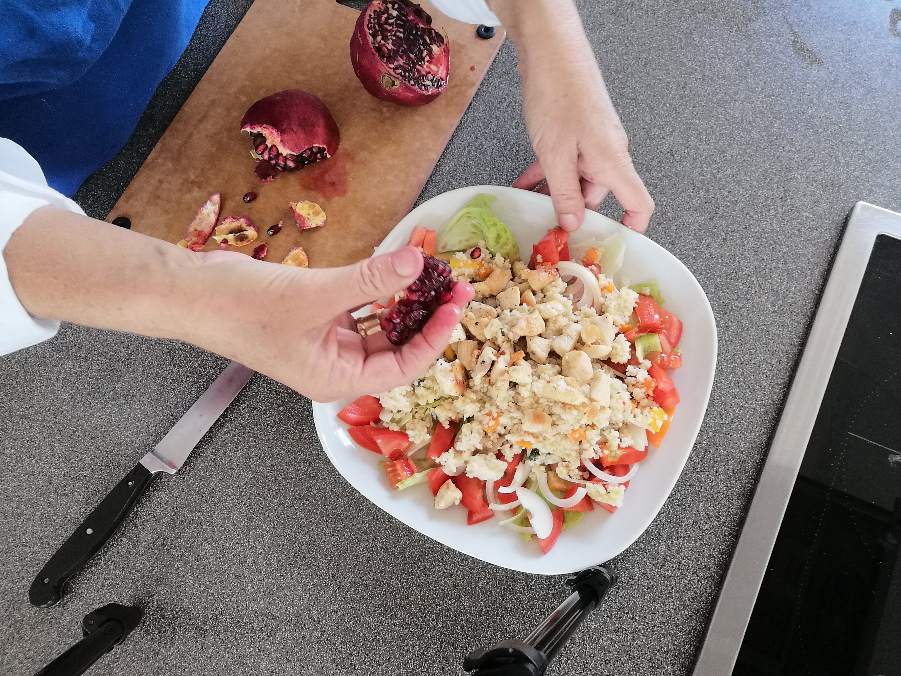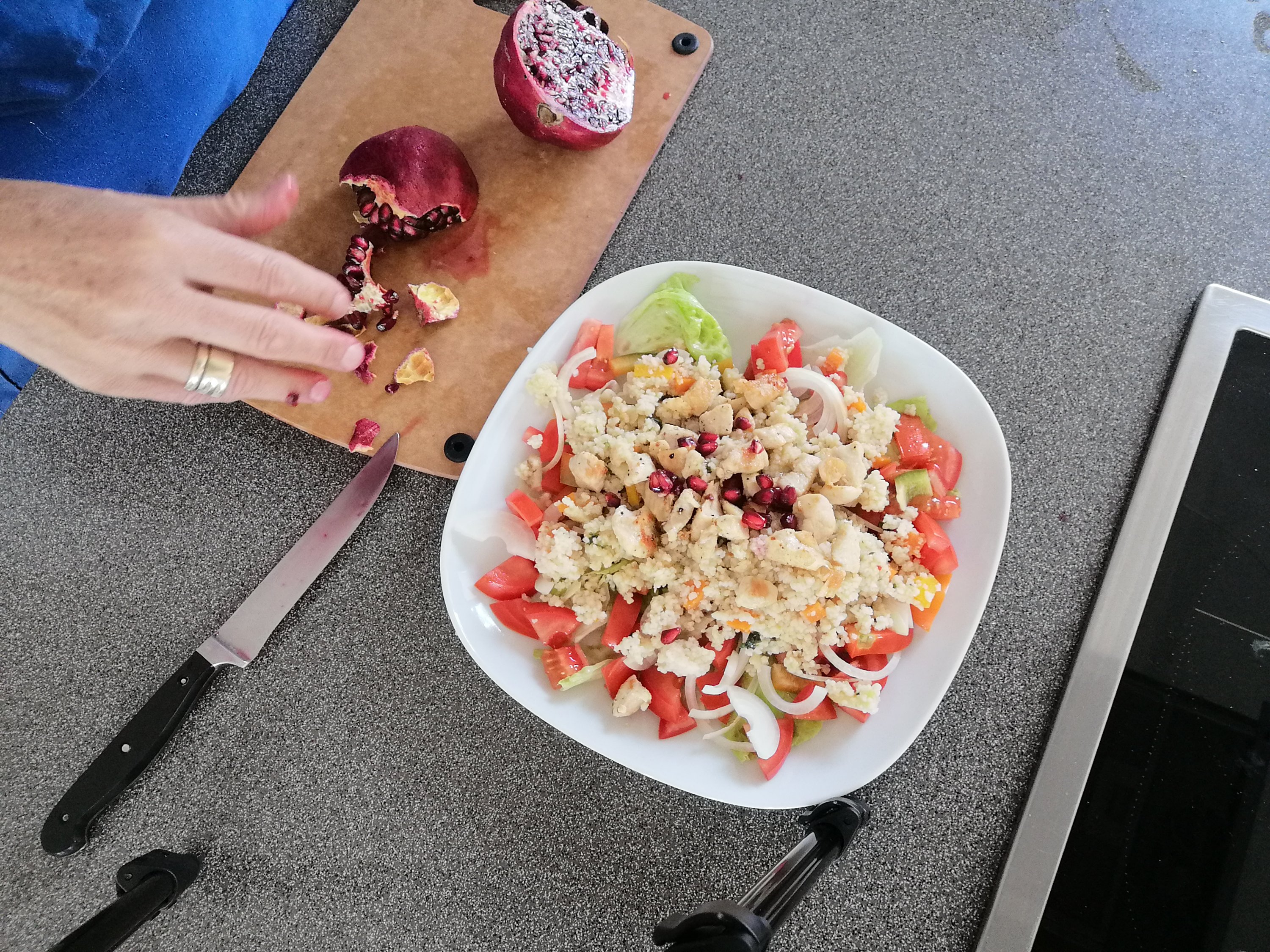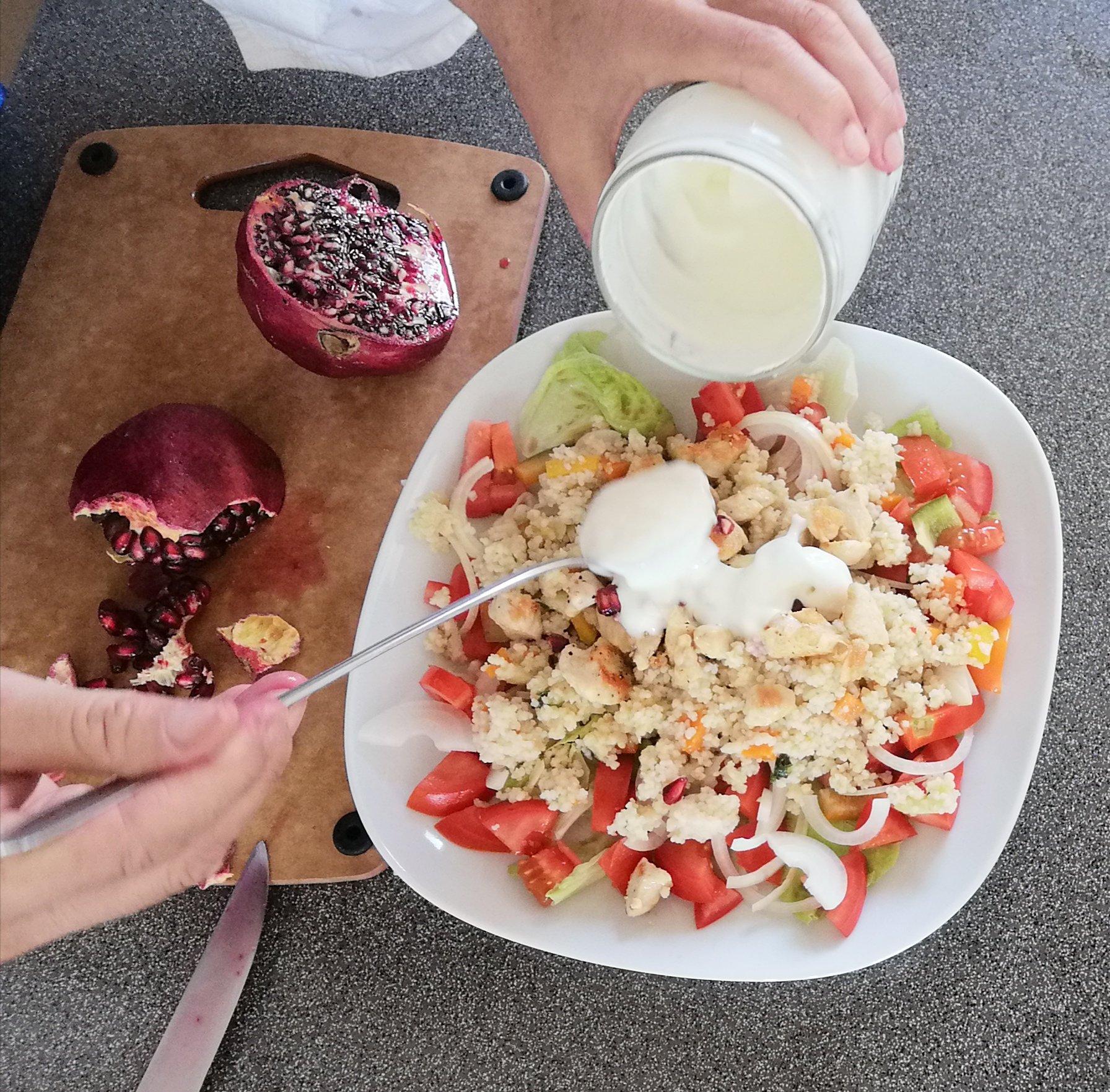 grüner salat als basis > gekochter und gewürzter couscous, paradeiser, grüner paprika und zwiebel darüber verteilen > dressing nach lust und laune