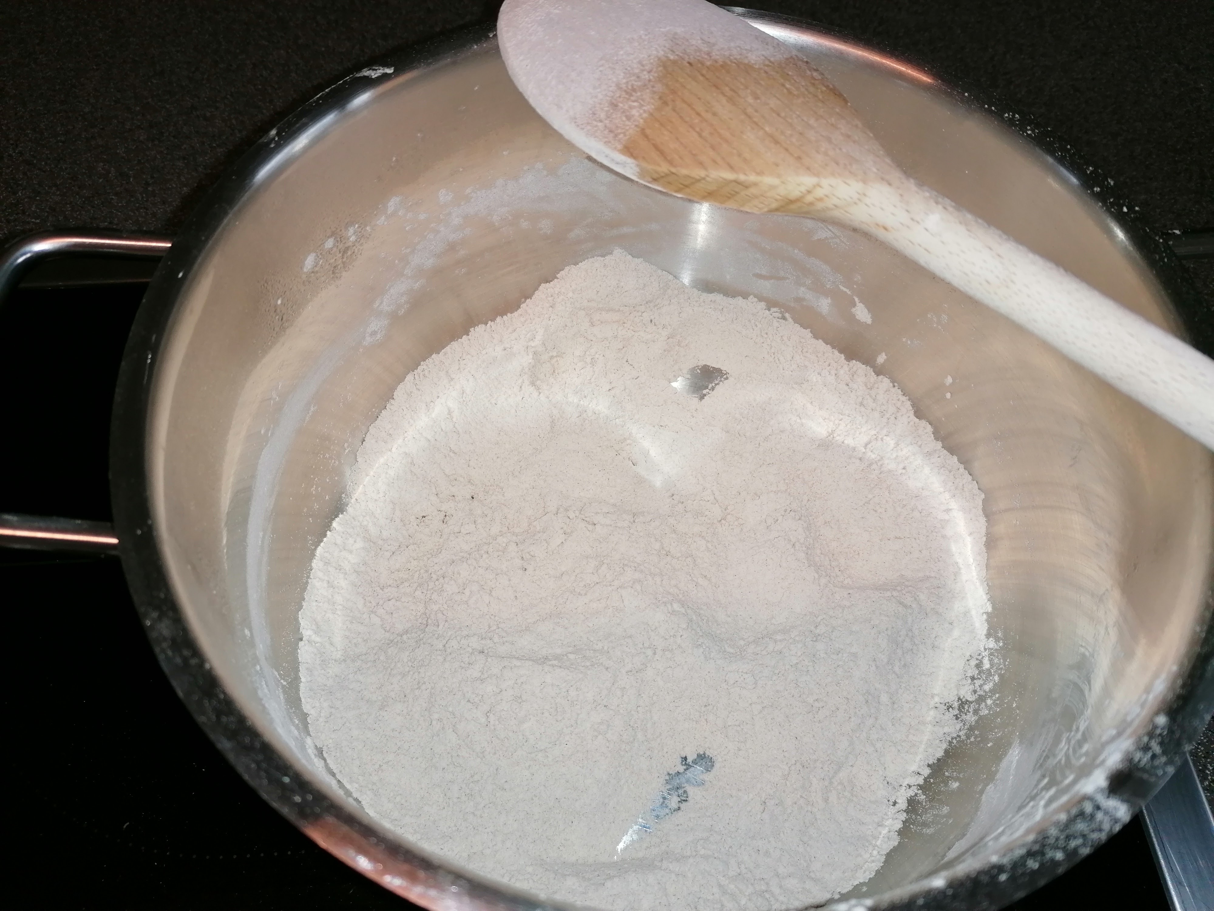 ca 300 g heidenmehl (buchweizenmehl) im topf heiß werden lassen > immer rühren, brennt leicht an