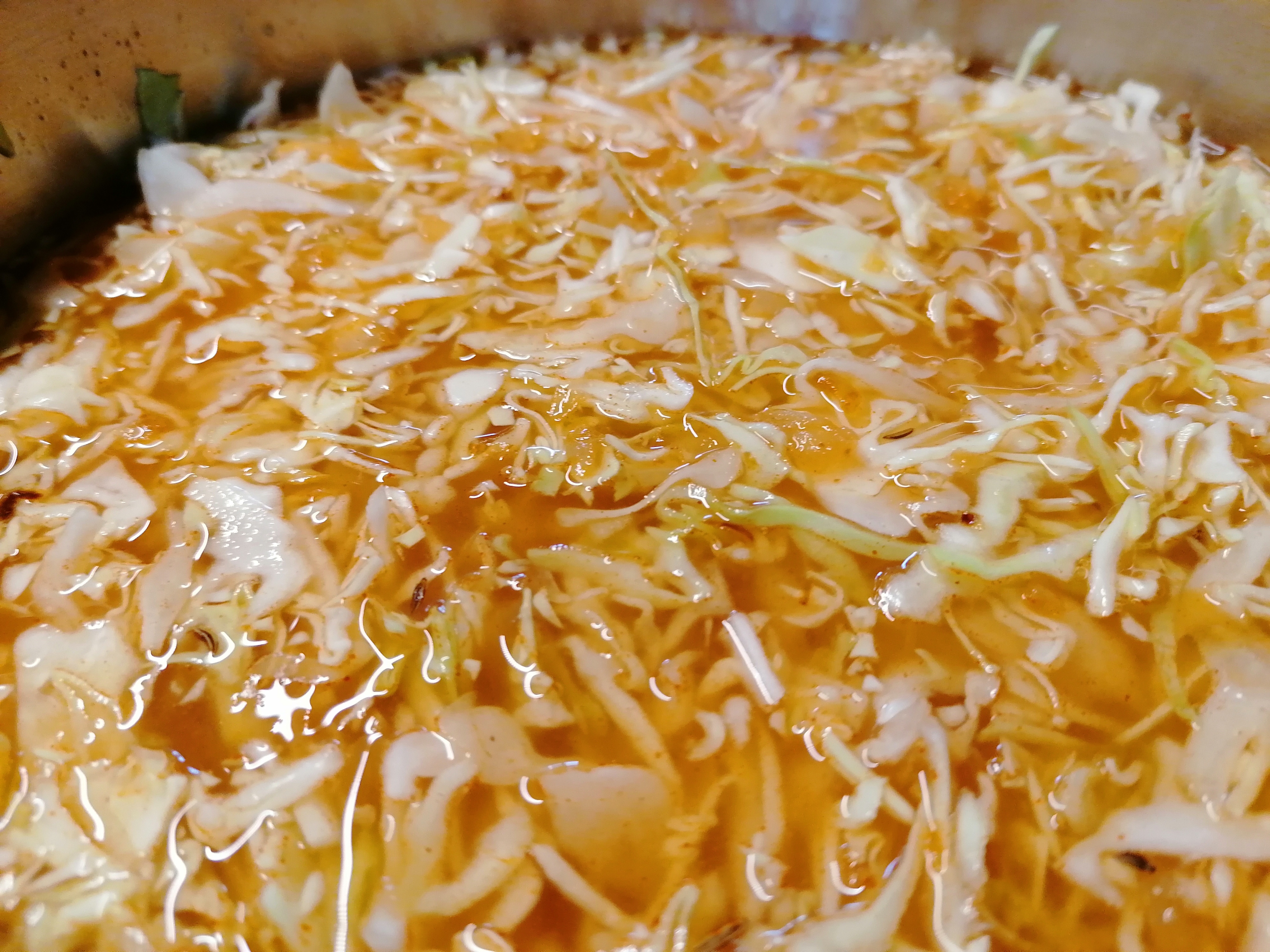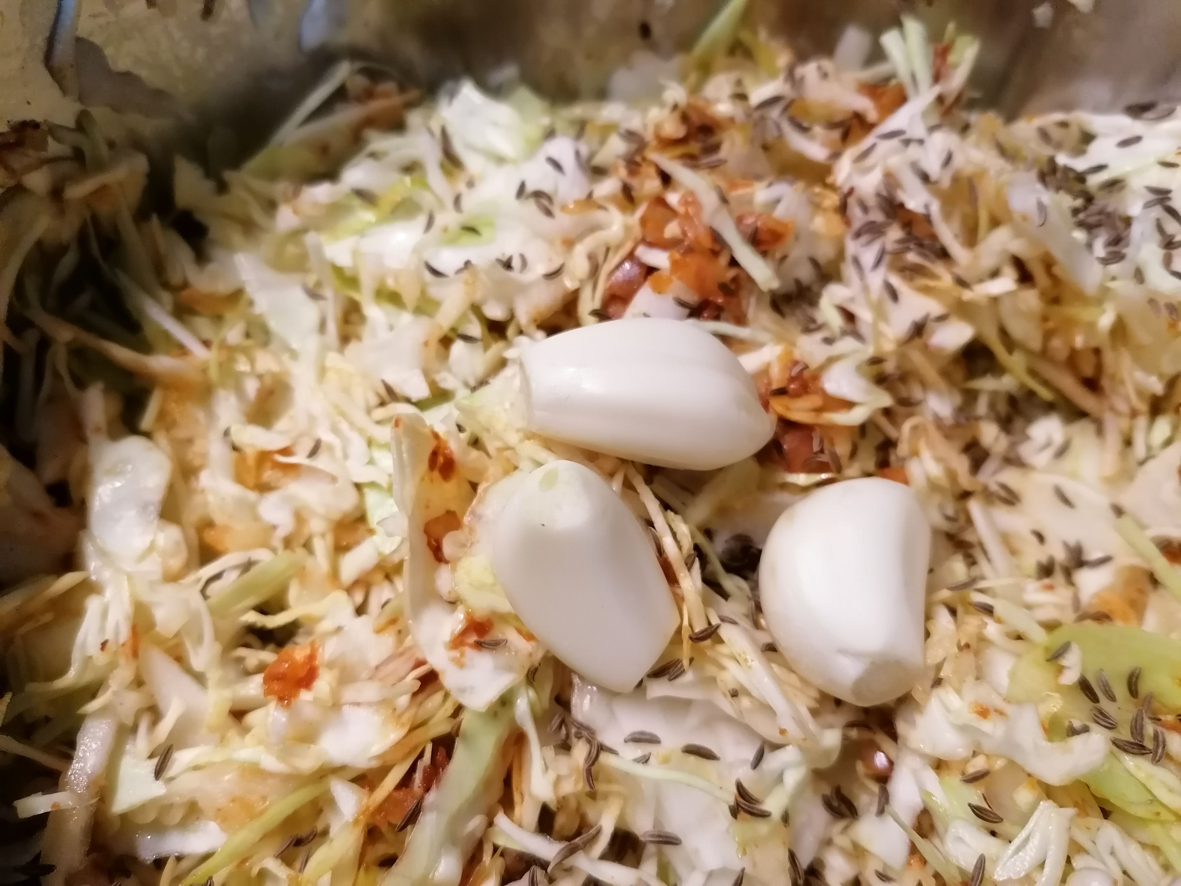 kraut feinschneiden > zweibel und roten, scharfen paprika anrösten > kraut dazu > mit deftiger rindsuppe aufgießen > köcheln lassen > kümmel, koblauch, pfeffer und salz dazu > so ca 1,5 std. ziehen lassen