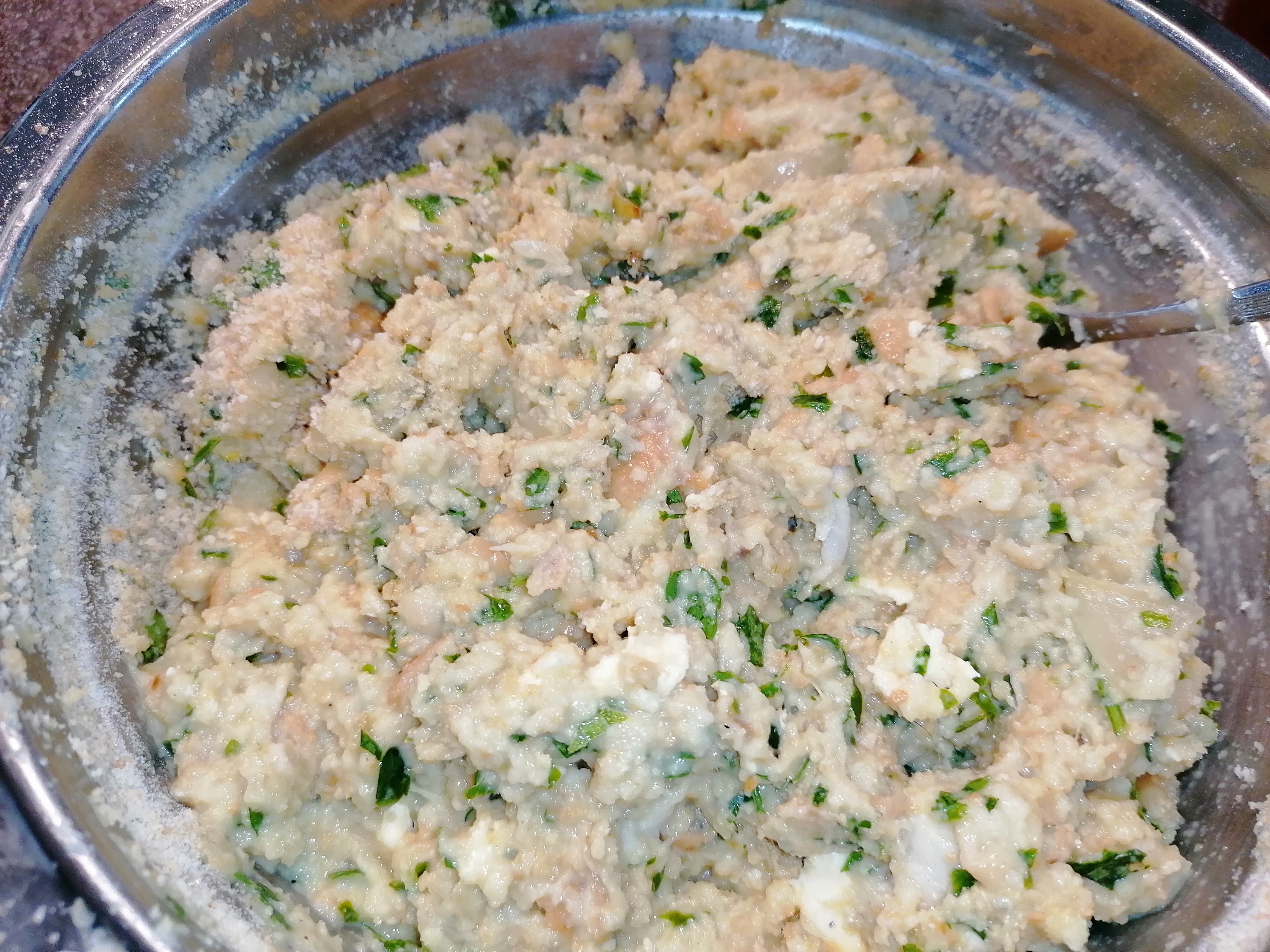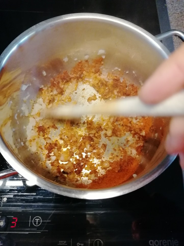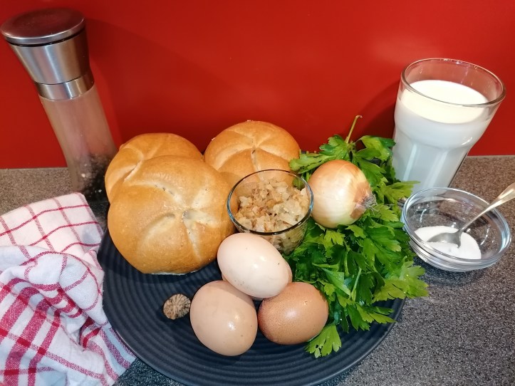 gerösteten zwiebel (ich nehme gleich vom gulaschzwiebelrösten etwas weg) mit restlichen Zutaten vermengen