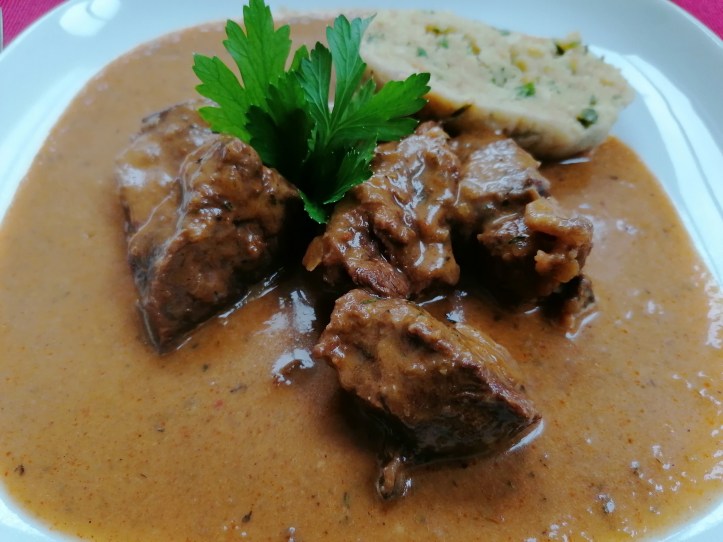 und zwar ein kräftiges, ungarisches und sehr geschmackvolles! samt semmelknödel