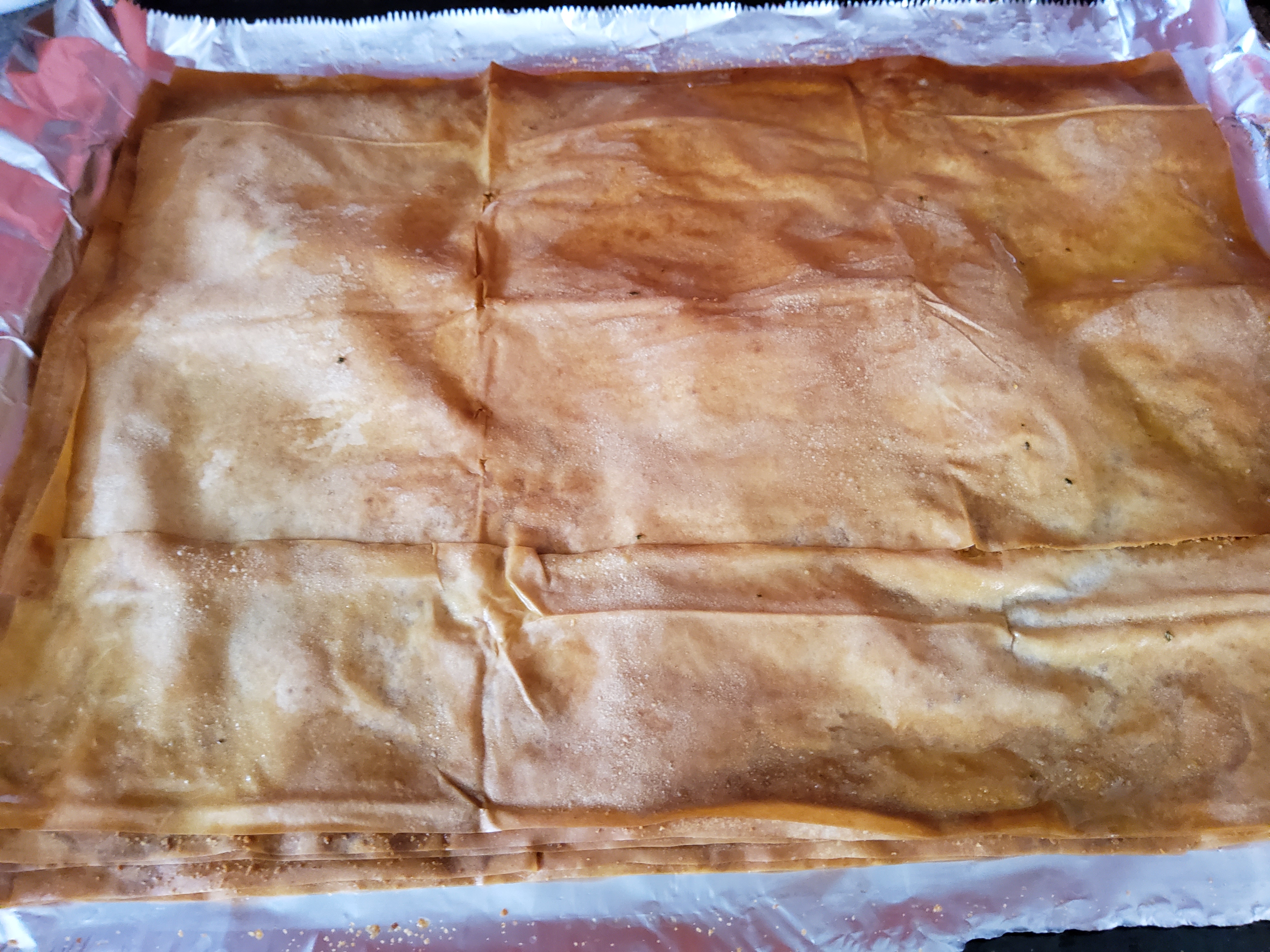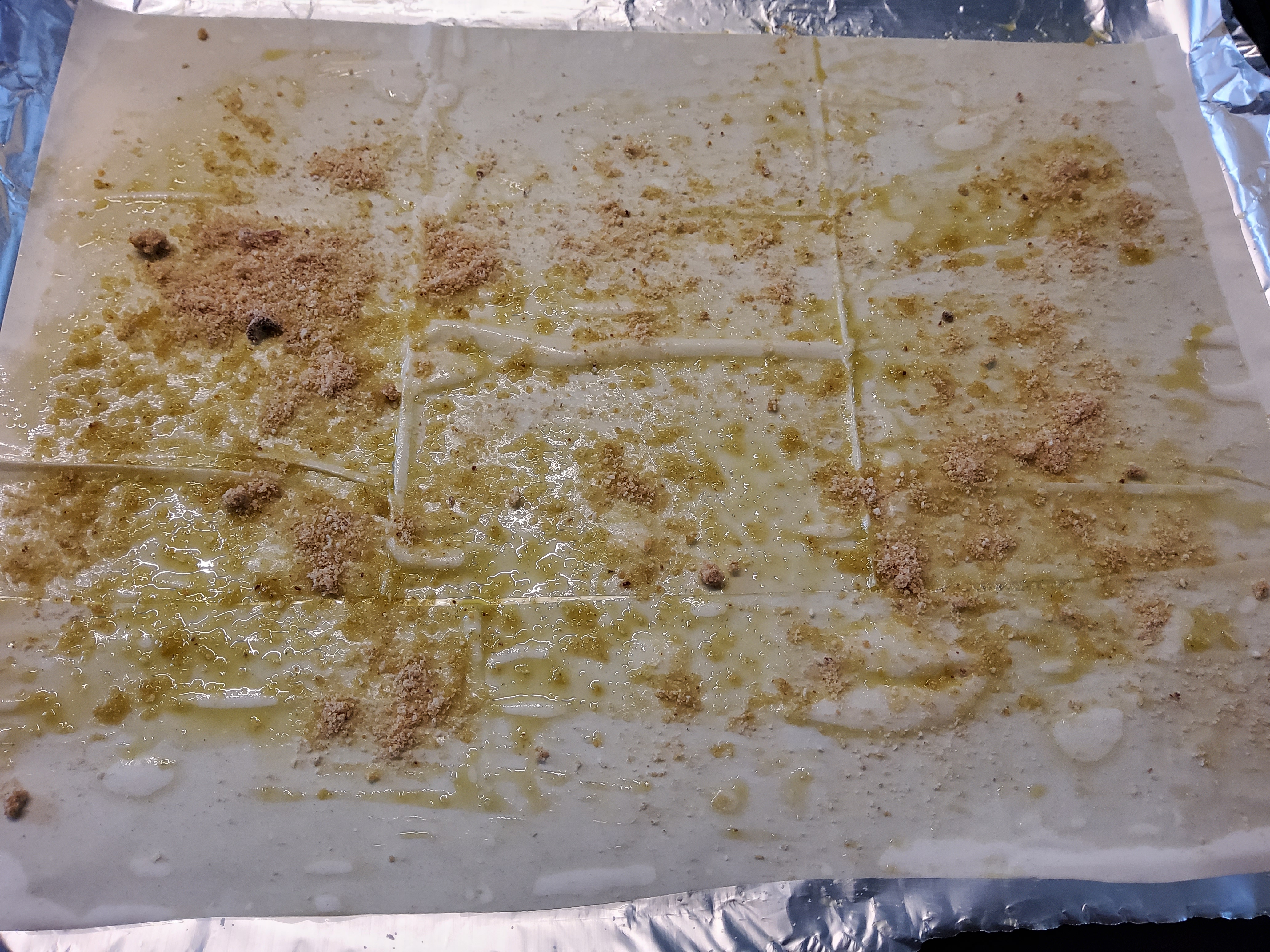 strudelteigblätter in schichten auflegen – dazwischen blätter mit basilikumöl einstreichen und brösel drauf – interessant, hm? bei 180°c 13 min backen