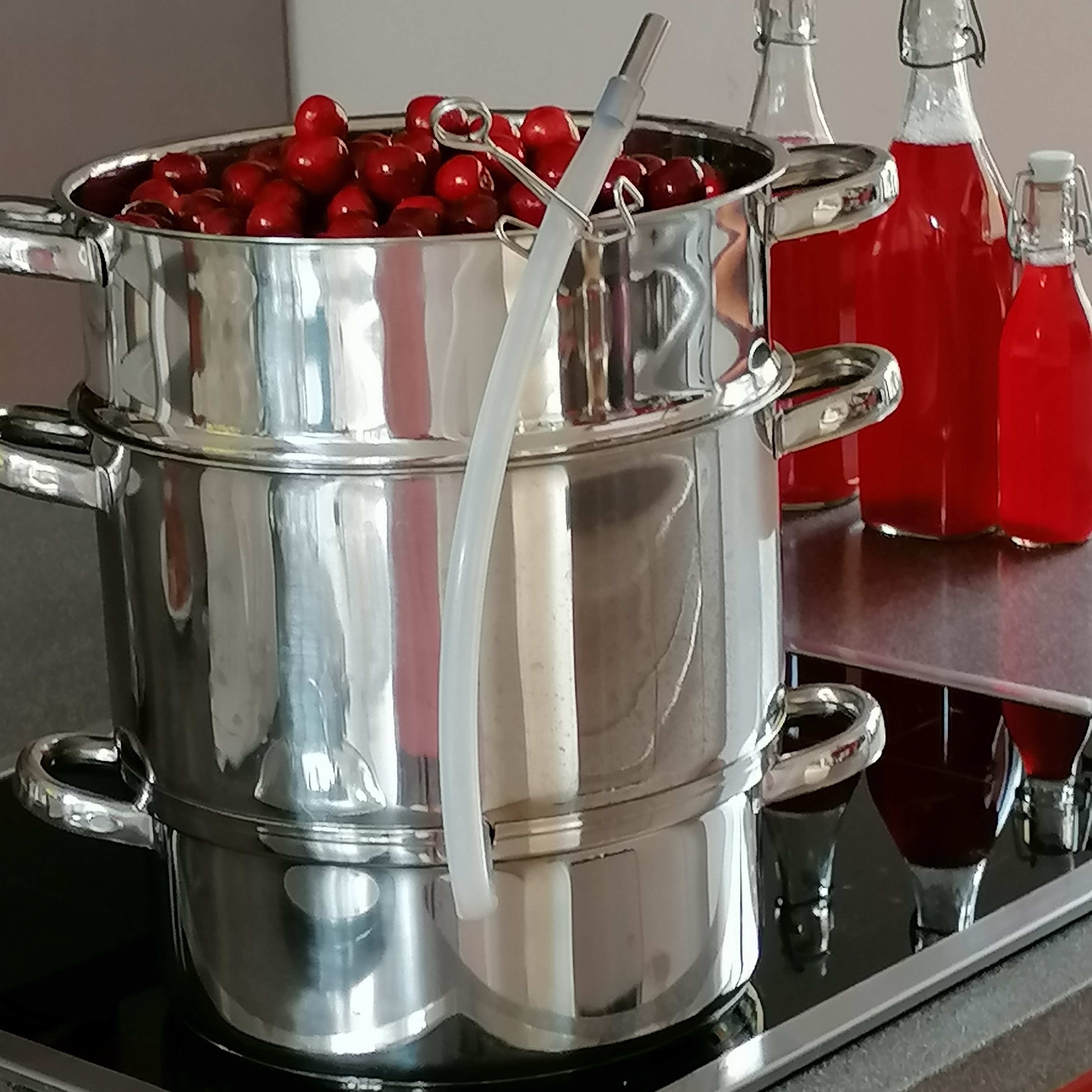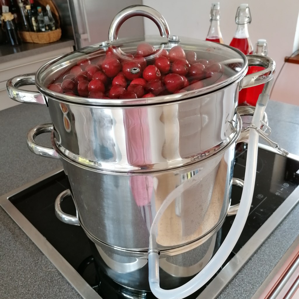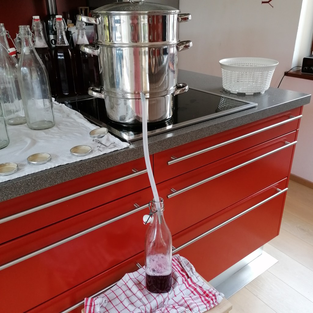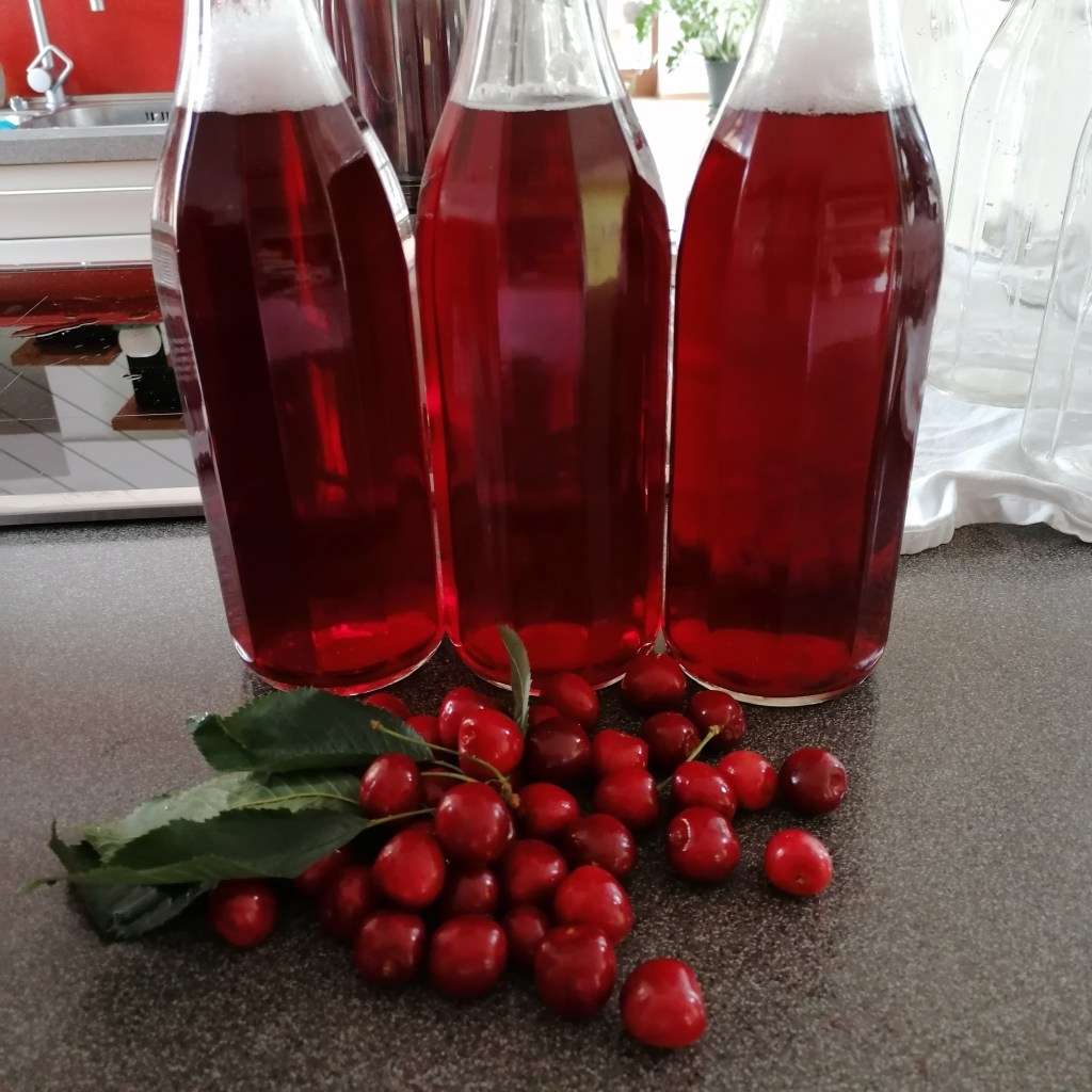 zwar eine kleine wissenschaft, aber nicht unmöglich. man braucht das richtige werkzeug und etwas kreativitätwarten, warten, warten…und irgendwann fängt es zu rinnen an. irgend etwas anderes als zusehen, ist fatal, denn dann geht alles über und du hast den saft überall dort, wo du ihn ganz hestimmt nicht haben willst 😏schon was ganz feines….kirschensaft mit leichtem minzgeschmack 😍