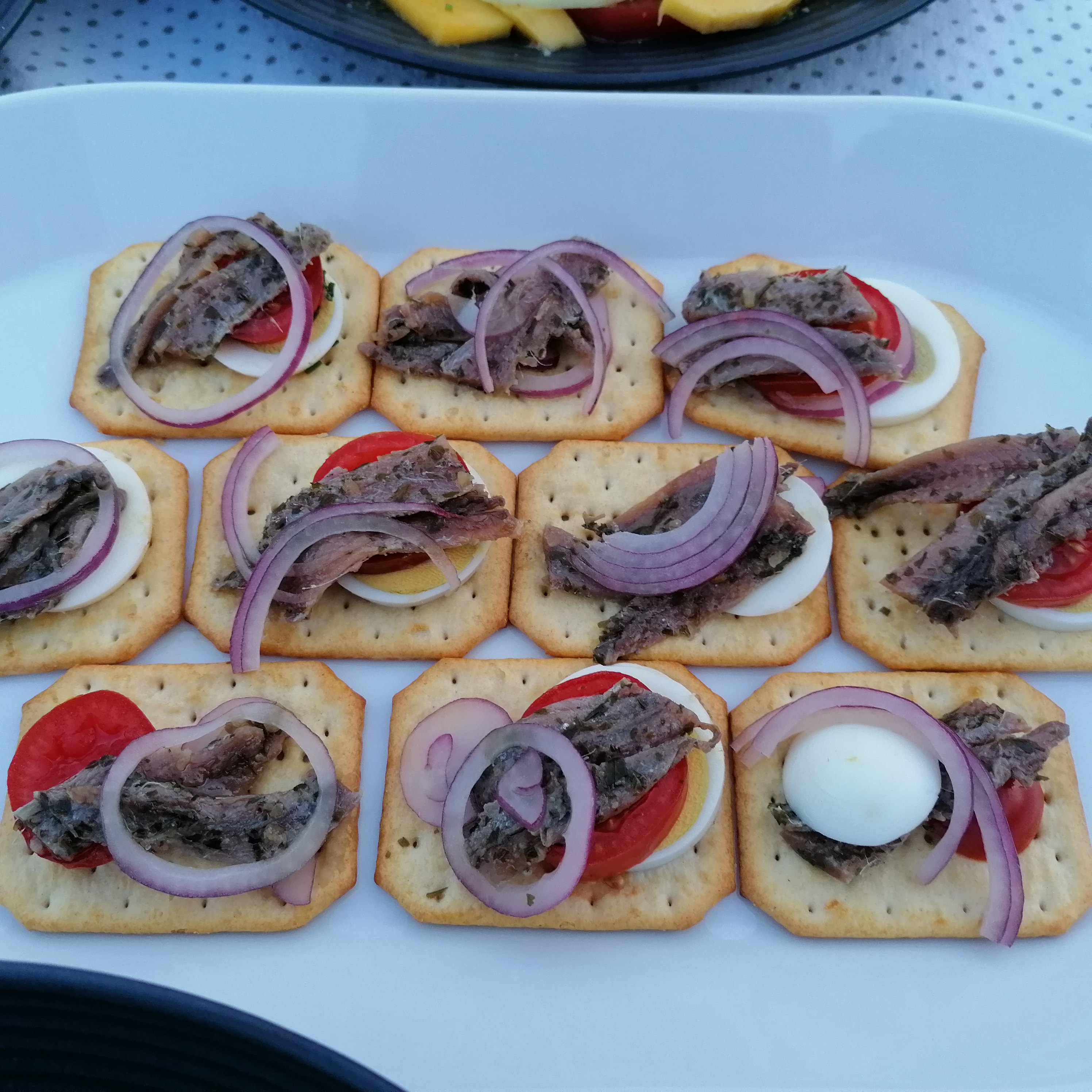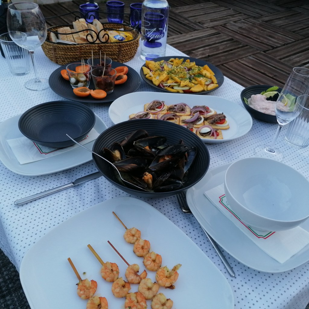 wir starten mit muscheln und proseccoklassisch in weissweinsaucemuscheln fertig, weiter mit den kleinen freunden da – aufgespiesst und scharf angebratenmangosalat mit roten zwiebeln und gurke -dressing aus zitronensaft, knoblauch, chilliflocken, etwas salz und olivenölstatt brot mal cracker – mit frischen sardellen und allerhand klimbim dazuerraten! shrimps in cocktailsauce. etwas tragisch als fingerfood zu essen – lieber mit einer gabel