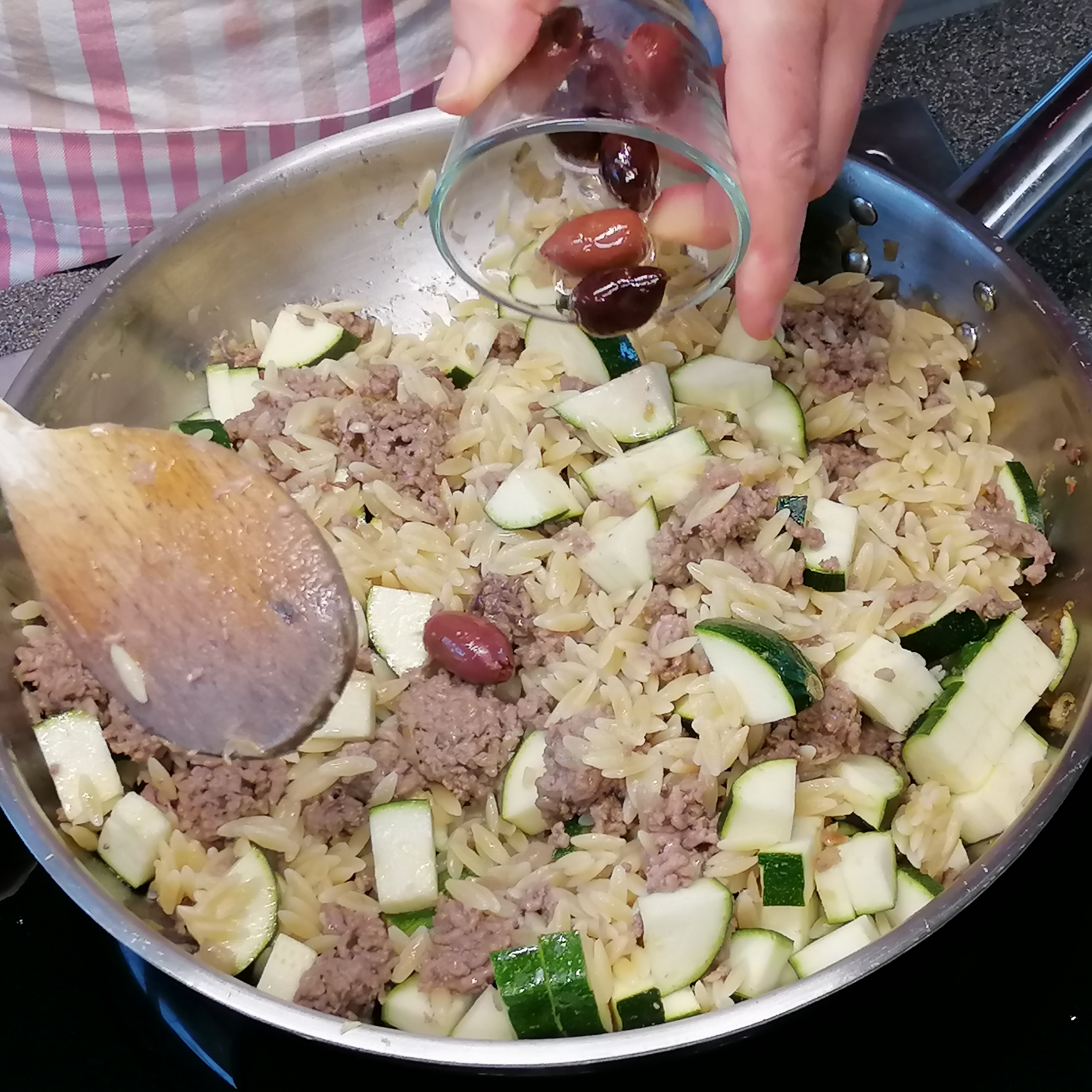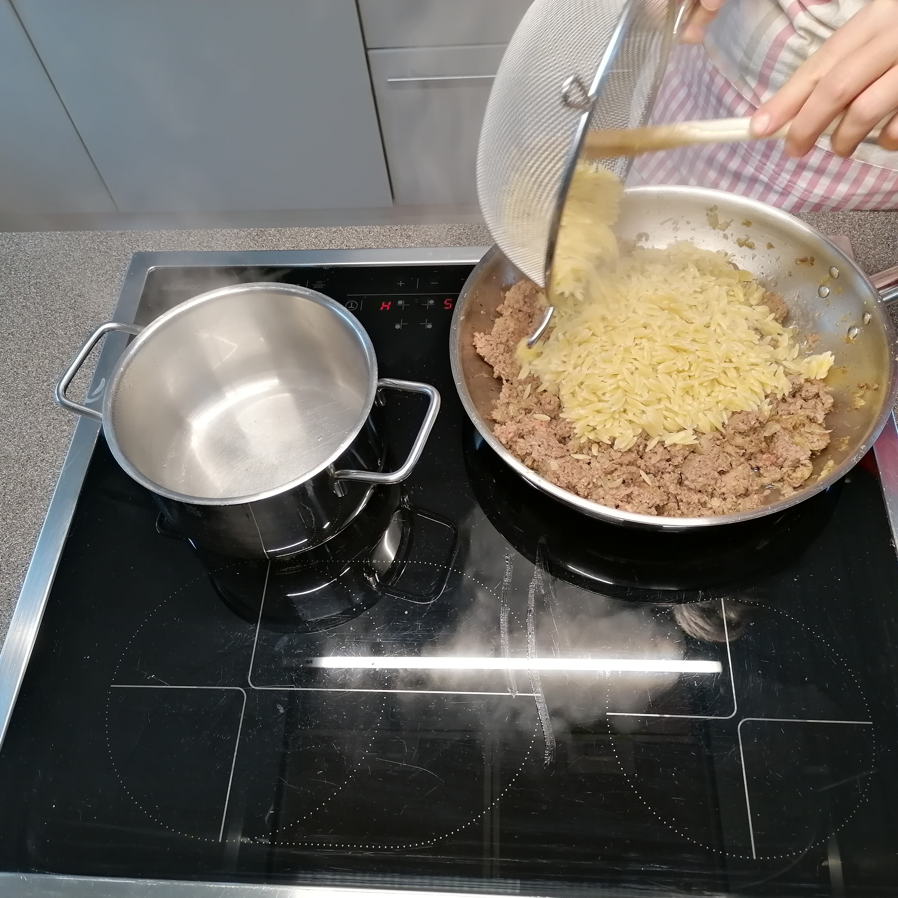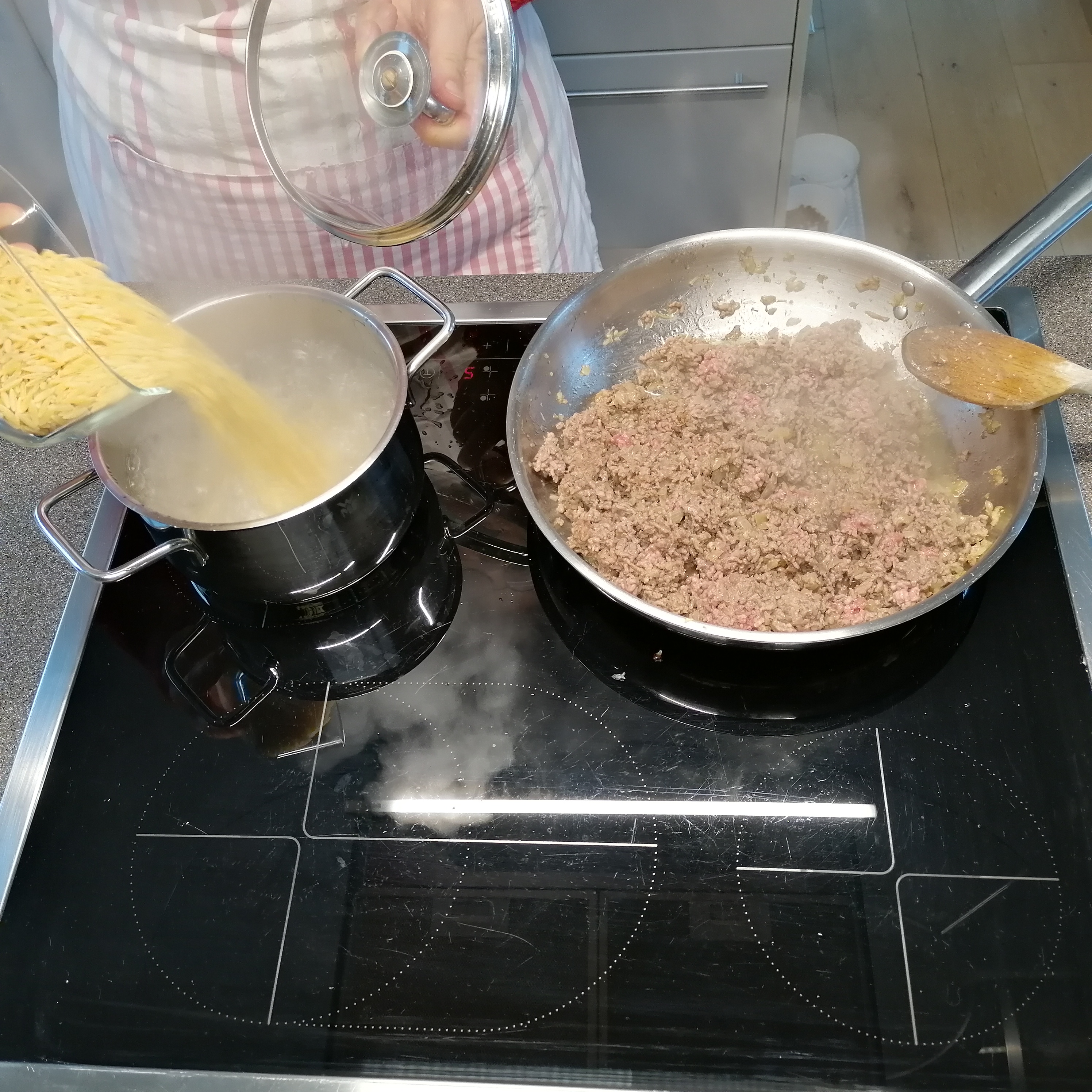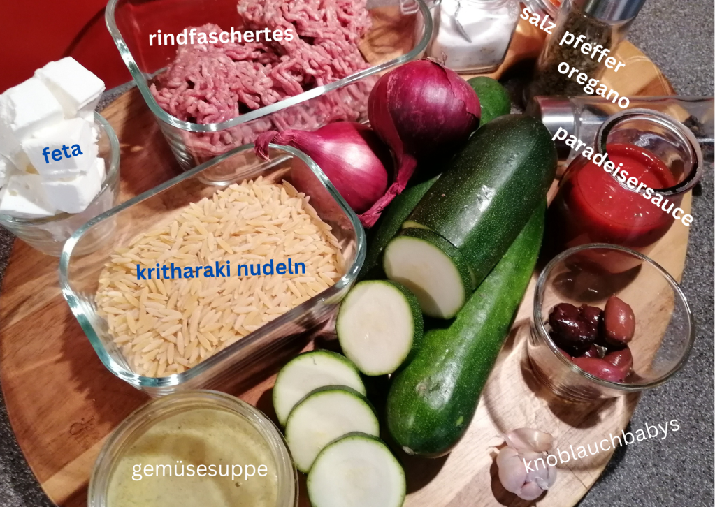 kleingeschnittene Zwiebel in öl golden anrösten > inzwischen die kritharakis bissfest kochen> rindfaschiertes und knoblauch zum gerösteten zwiebel > krümelig anbraten >