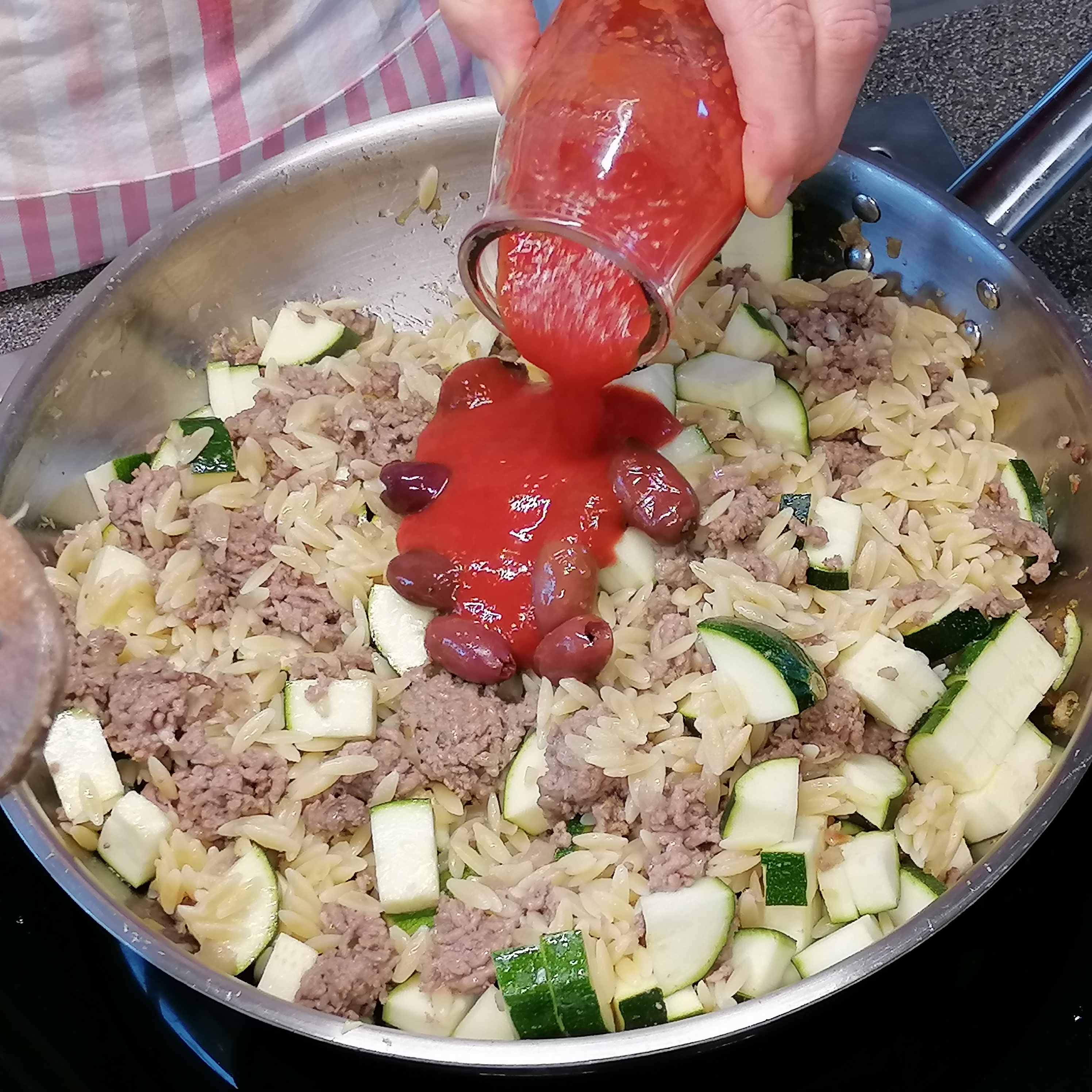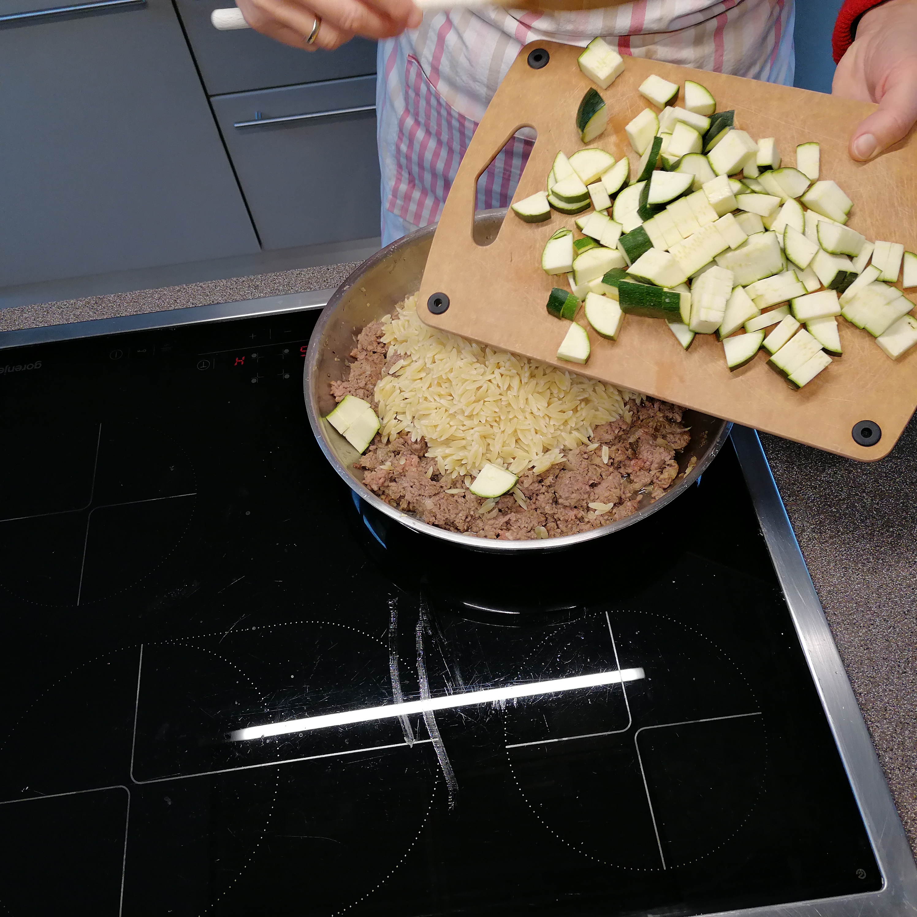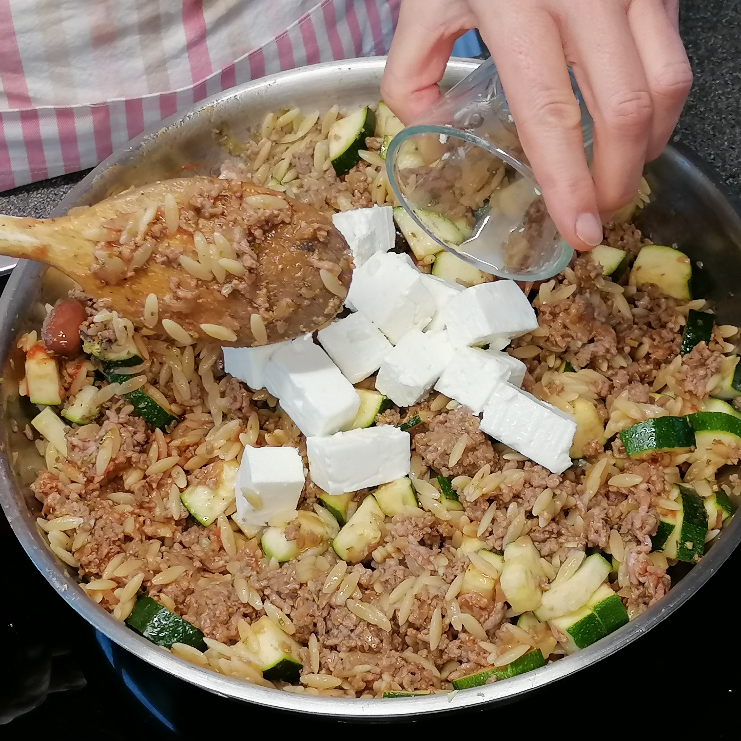kleingeschnittene Zwiebel in öl golden anrösten > inzwischen die kritharakis bissfest kochen> rindfaschiertes und knoblauch zum gerösteten zwiebel > krümelig anbraten >