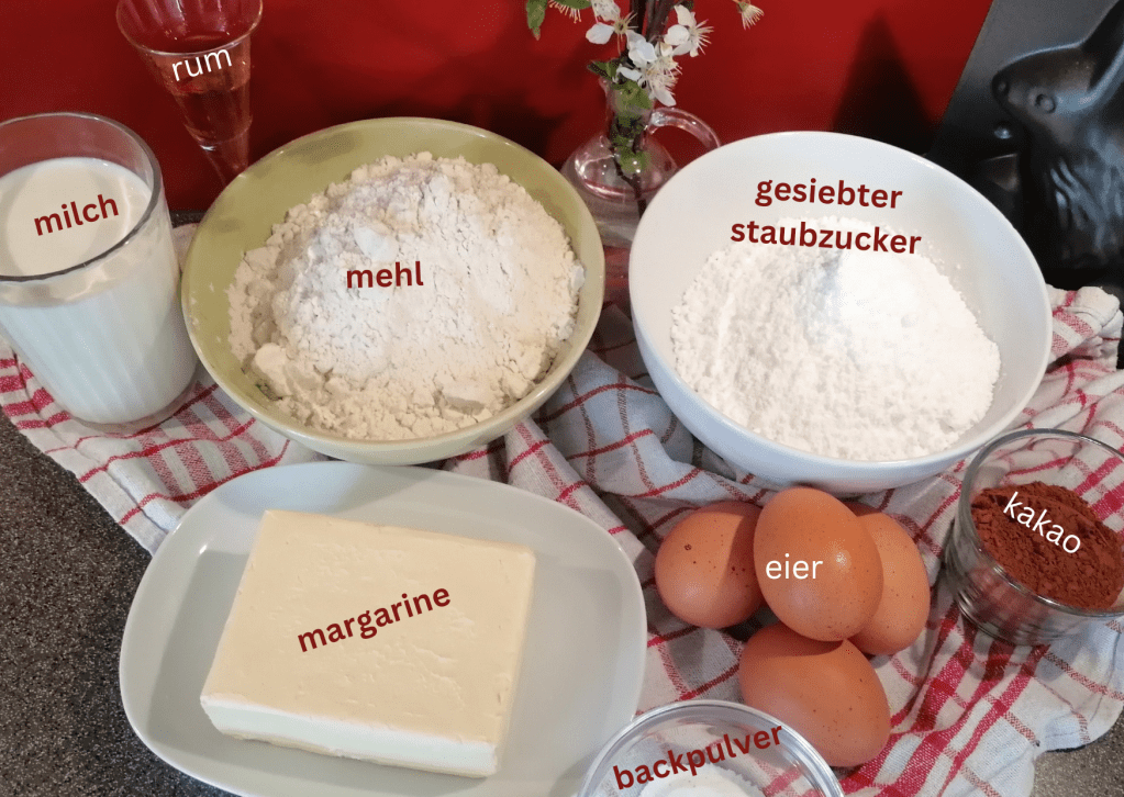 das brauchst du dafür: 250g margarine > 250g staubzucker > vanillezucker > 350g mehl > 4 eier > etwas rum > 1/4 l milch > 3 el kakao