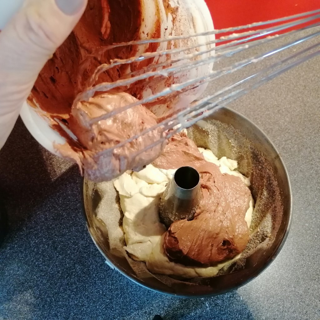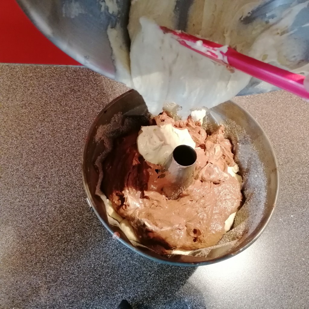 ca ein drittel des teiges wegnehmen und mit dem kakao vermischen > abwechselnd helle masse und dunkle masse in die form füllen