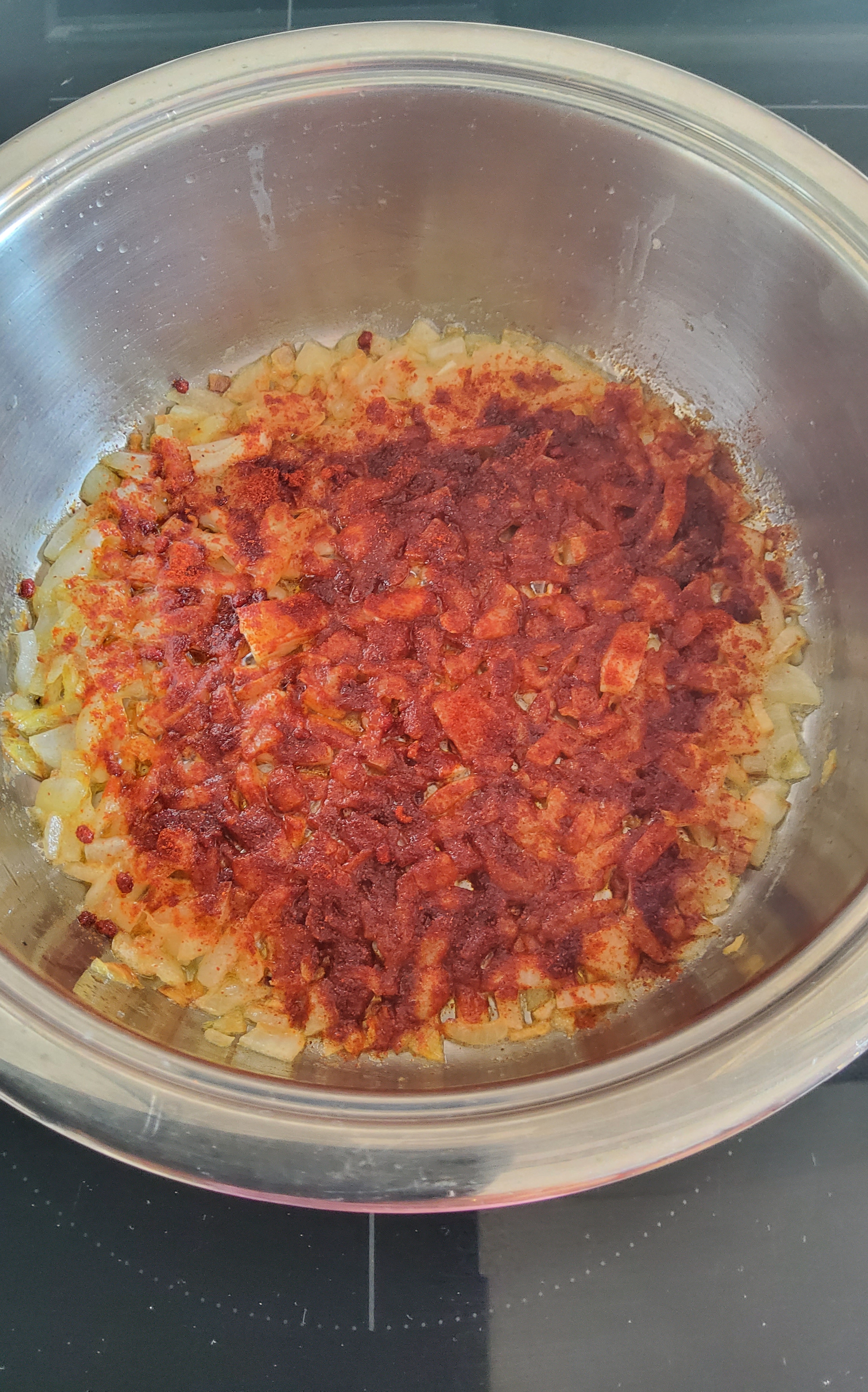dazu mit der hälfte der gerösteten zwiebel weitermachen > goldgelb rösten > rotes paprikapulver unterrühren > gehakte eierscheammerl und petersilie dazu > alles kutz rösten und mit wenig wasser ablöschen > 20 min kochen lassen