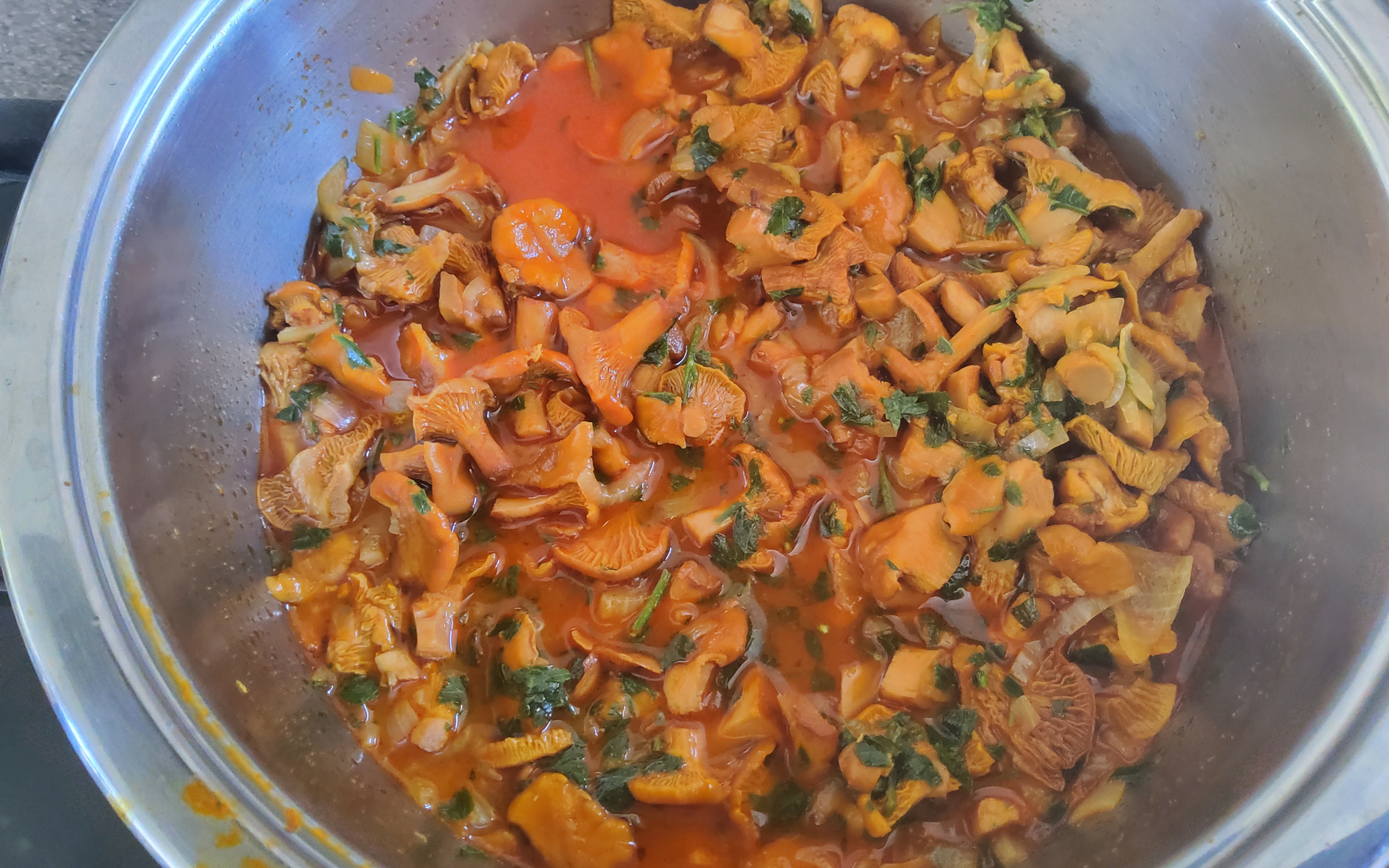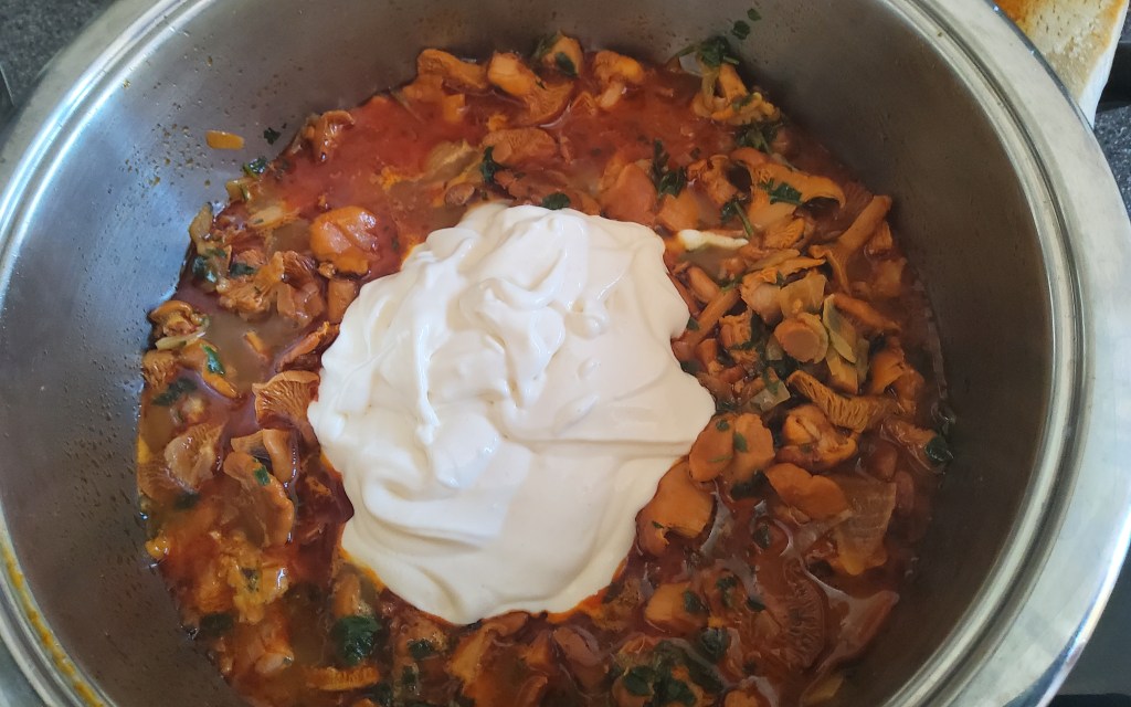 zutaten für zwei hungrige: 1/2 kg sauber geputzt eierschwammerl > zwiebel > petersilie > rotes paprikapulver > salz > sauerrahm > obers > mehl >
