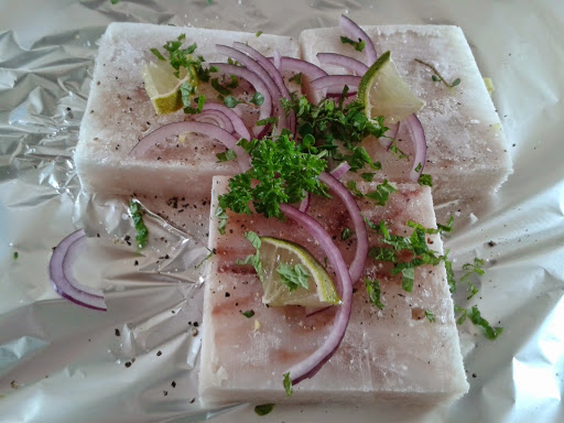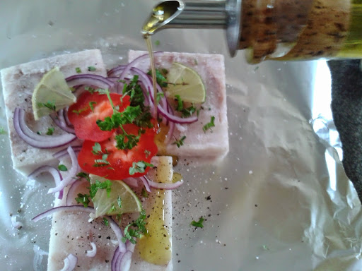 kabeljau auf alufolie legen > salzen, pfeffern >